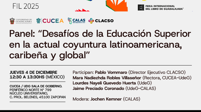 Participan: Pablo Vommaro (Director Ejecutivo CLACSO), Mara Nadiezhda Robles Villaseñor (Rectora CUCEA-UdeG), Lourdes Nayeli Quevedo Huerta (UdeG), Jaime Preciado Coronado (UdeG-CALAS),