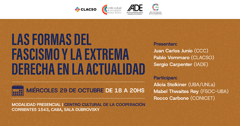 En el marco del ciclo “A 80 años de la derrota del nazismo, desafíos democráticos de ayer y de hoy”, organizado por el Centro Cultural de la Cooperación (CCC), el Instituto Argentino para el Desarrollo Económico (IADE) y el Consejo Latinoamericano de Ciencias Sociales (CLACSO), se realizó el miércoles 29 de octubre la charla-panel “Las formas del fascismo y la extrema derecha en la actualidad”, cuarta y última actividad del ciclo.